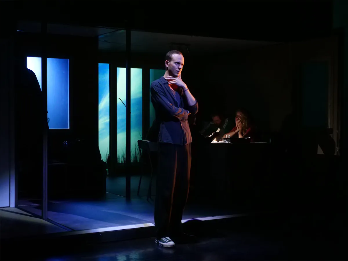 La tension passe alors autrement que par la langue. Par les gestes, la mise en espace, les ombres, la scénographie. Là où l'écriture de Lagarce nous place habituellement à distance de la pièce, Guillaume Barbot parvient à rendre cette famille proche de nous. Seul Louis se détache, seul Louis est ailleurs. Il est à contretemps. Et à contre-ton. Mathieu Perotto est le Louis parfait. Un côté spectral, déjà légèrement évaporé, déjà parti. Ce grand corps qu'il essaie de faire prendre moins de place, ses mains qui frôlent pour ne pas toucher.