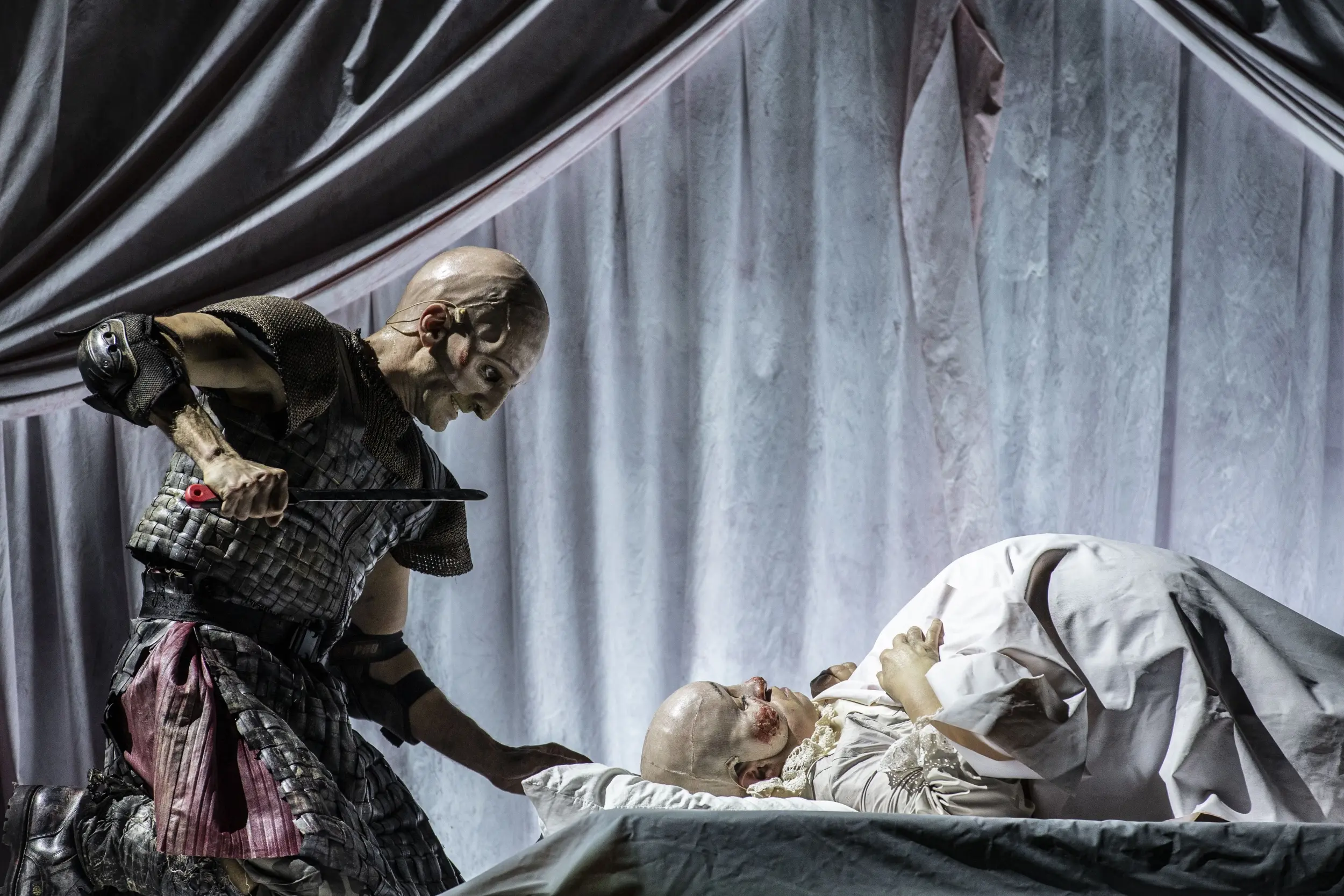 Le Munstrum, compagnie créée par Louis Arene et Lionel Lingelser, est immédiatement reconnaissable grâce à cette esthétique qui lui est propre : ces masques chauves qui nous transportant tout de suite dans un ailleurs étrange. Ça fait des années que je les suis, et ils m'ont fait passer par tous les états : parfois captivée et bouche bée, comme avec Le Mariage Forcé qui m'avait fait découvrir une noirceur jusqu'ici insoupçonnée chez Molière, parfois plus à distance avec des textes vraiment exigeants comme lorsqu'ils s'attaquent à Copie. Alors j'avais un peu peur : parce que niveau exigence, Shakespeare, ça se pose là. Mais je pense que ce Makebth signe l'une de mes propositions préférées du Munstrum !